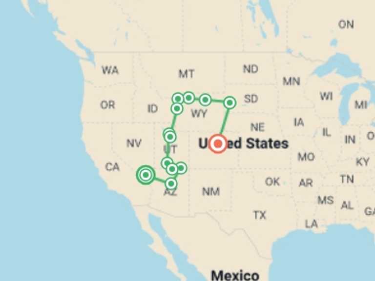 Las Vegas, Salt Lake City, Yellowstone National Park, Buffalo, Wyoming, Rapid City, Denver, Flagstaff, Page, Bryce Canyon National Park, Alpine, Jackson, Cody