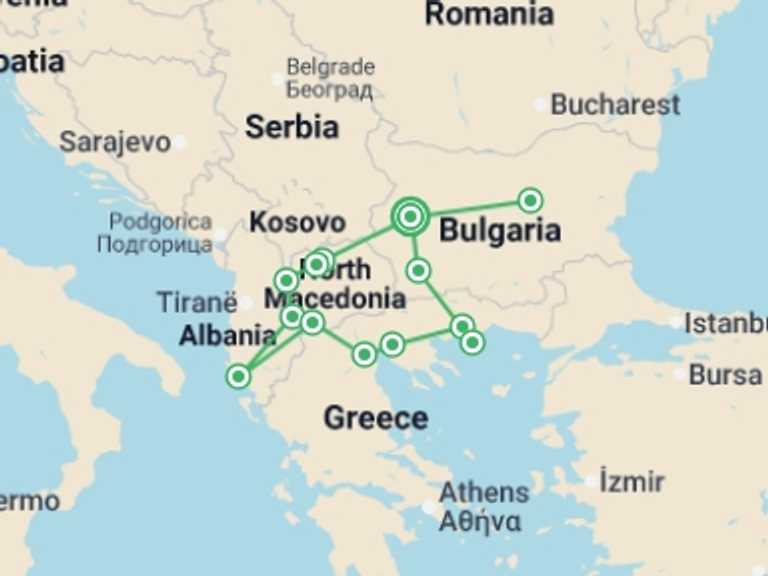 Sofia, Skopje, Elena, Bulgaria, Thessaloniki, Kavala, Thassos, Bansko, Matka Canyon, Mavrovo National Park, Ohrid, Albanian Riviera, Pelister National Park, Vergina