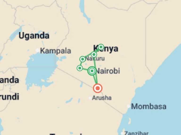 Kilimanjaro, Arusha, Nairobi, Serengeti National Park, Ngorongoro Crater, Lake Elementaita, Lake Nakuru National Park, Masai Mara National Reserve, Tarangire National Park