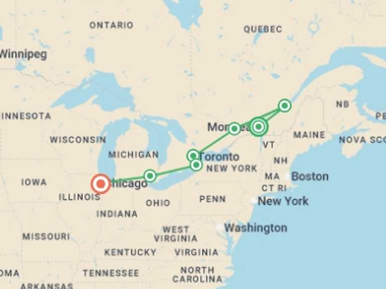 Chicago, Montreal, Quebec City, Ottawa, Toronto, Niagara Falls, Detroit