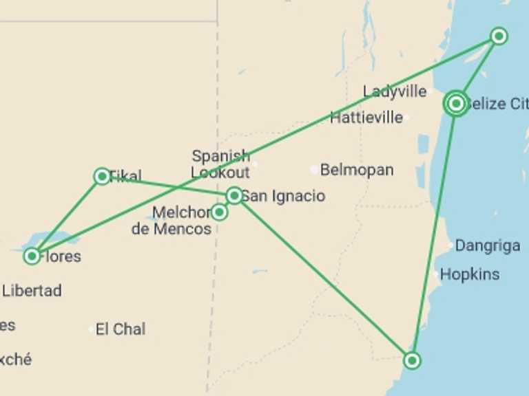 Belize City, Flores, Caye Caulker, Placencia, San Ignacio, XUNANTUNICH MAYA TEMPLE, Tikal
